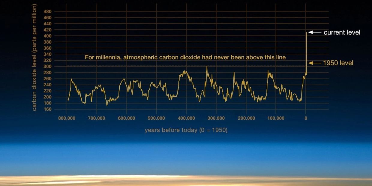 Today, we are witnessing CO2 levels which have never been seen before in human history. In fact, for over 1 million years, CO2 levels have never exceeded 300 ppm. In 1950 we crossed that threshold. Since 1950, it has doubled. (Credit NASA).