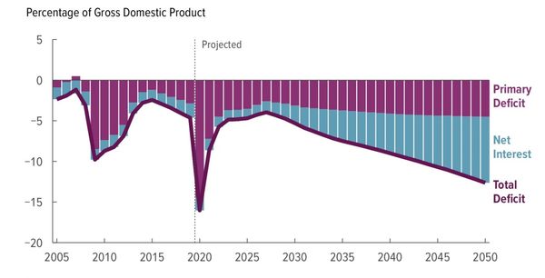 Our current outlays for interest are $345 billion. That amounts to 1.6% of our total GDP and 5.3% of our total spending. The CBO's latest assessment (see chart above) estimates these numbers to increase significantly... approaching 200% of GDP withing 30 years.